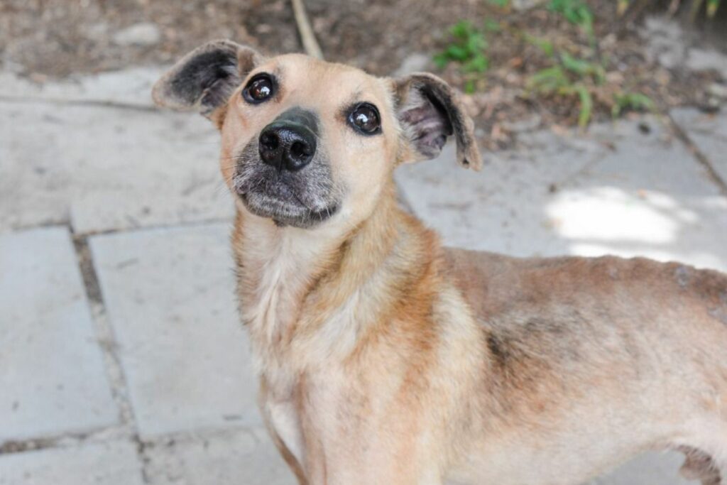 Vi vet ikke årsaken til at Simba fikk en så dårlig start på livet, men han ble heldigvis reddet av en modig og klok nabo som tok ham til en dyreklinikk der de også har en kennel for hjemløse hunder og katter. Han var ekstremt underernært og svak, med smertefulle, betente sår på hoftebeina og hovne ledd. Han hadde nesten mistet all pelsen, og fremtiden så ikke lys ut.
